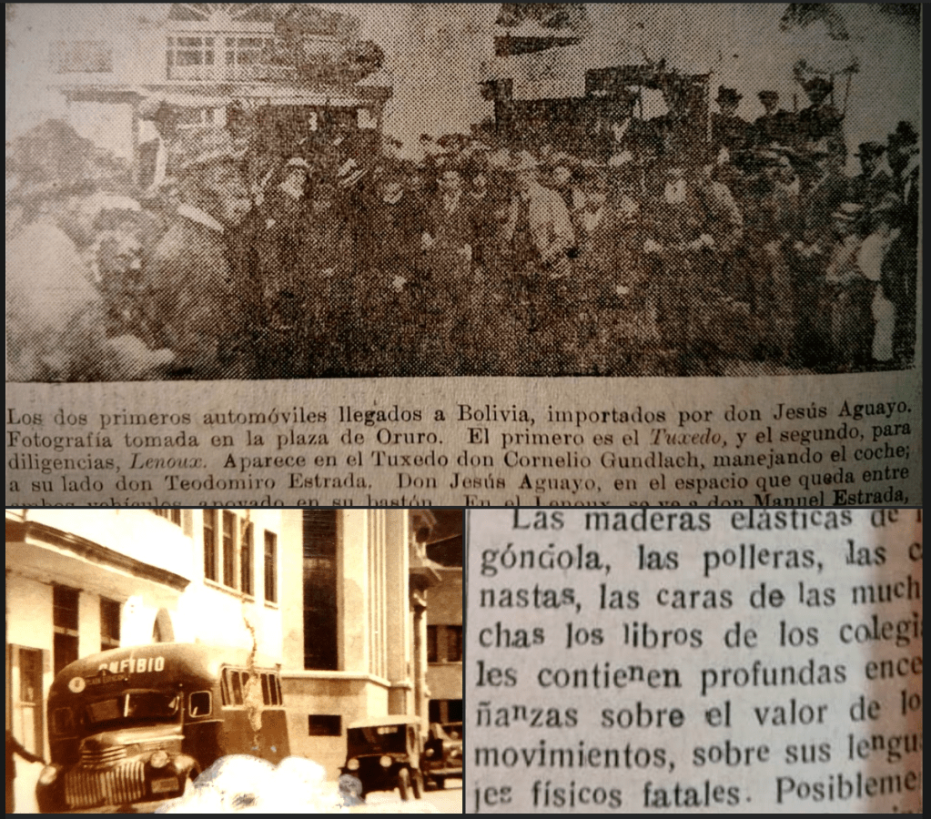 The automobiles were intended for Cochabamba, but upon reaching Oruro – our chronicler relates – a bet was made, where Arturo Posnansky bet 5,000 Bs, that he would beat a diligence, with the AUTOMOBILE winning the bet, with Mr. Moíses Ascarrunz, the then prefect of Oruro, as witness… the “horseless carriage” ENTERED the city of La Paz, amidst the excitement of its citizens who saw for the FIRST TIME SUCH A STRANGE DEVICE arriving from Oruro.