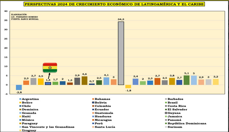 Bolivia ranks 20th out of 28 countries in the region, with a projected growth of 1.4%, which is below the growth of Latin America and the Caribbean (LAC) and the regional average of 3.72%, according to the latest report from the World Bank.