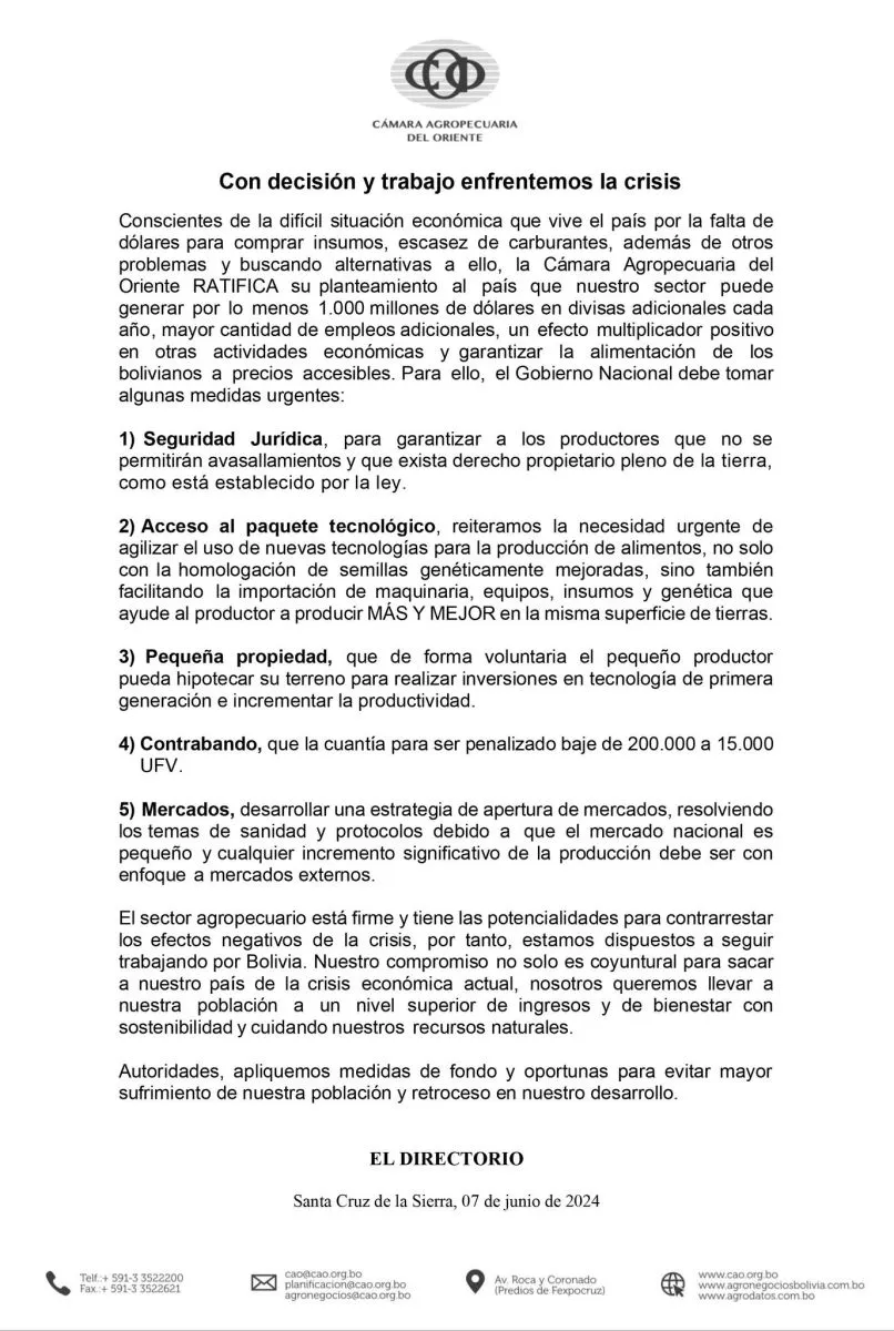 Given this scenario, the sector proposed these five measures, which, if applied, could generate at least $1 billion in additional foreign exchange each year, create more jobs, have a positive multiplier effect on other economic activities, and ensure affordable food for Bolivians.