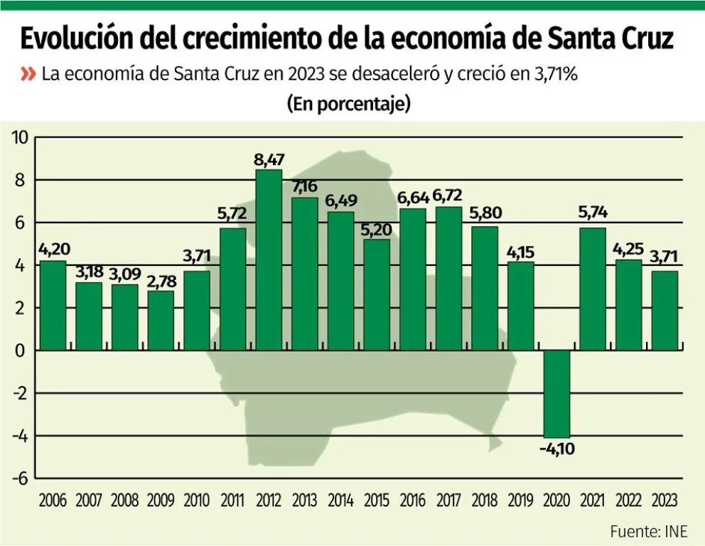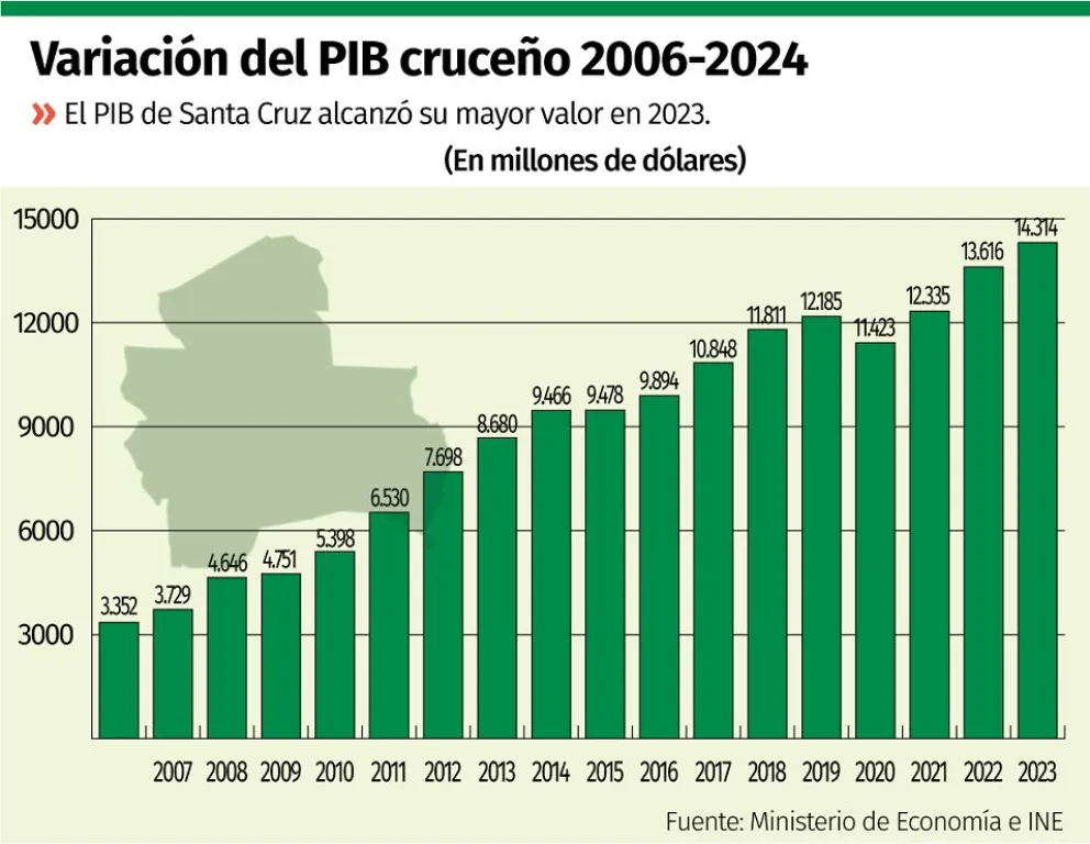 This September 24th, the department of Santa Cruz marks another anniversary of its fight for freedom. Last year, its GDP reached $14.314 billion, according to data from the National Institute of Statistics (INE), with an economic growth rate of 3.71%, lower than the 4.25% reported in 2022.