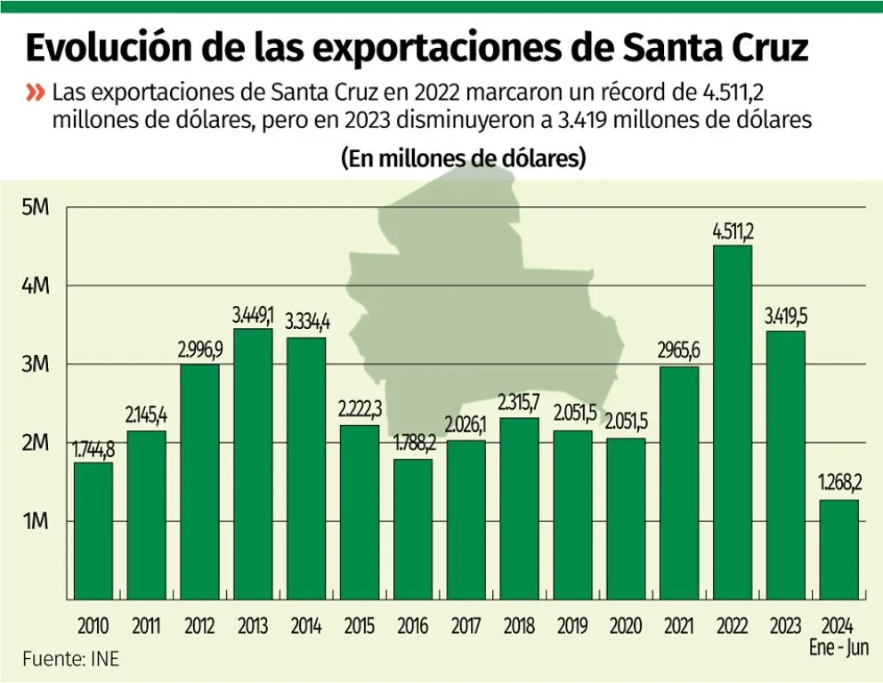 El año pasado, las exportaciones de Santa Cruz alcanzaron un valor de 3.419,5 millones de dólares, y al primer semestre de este año las ventas del departamento suman 1.268 millones.