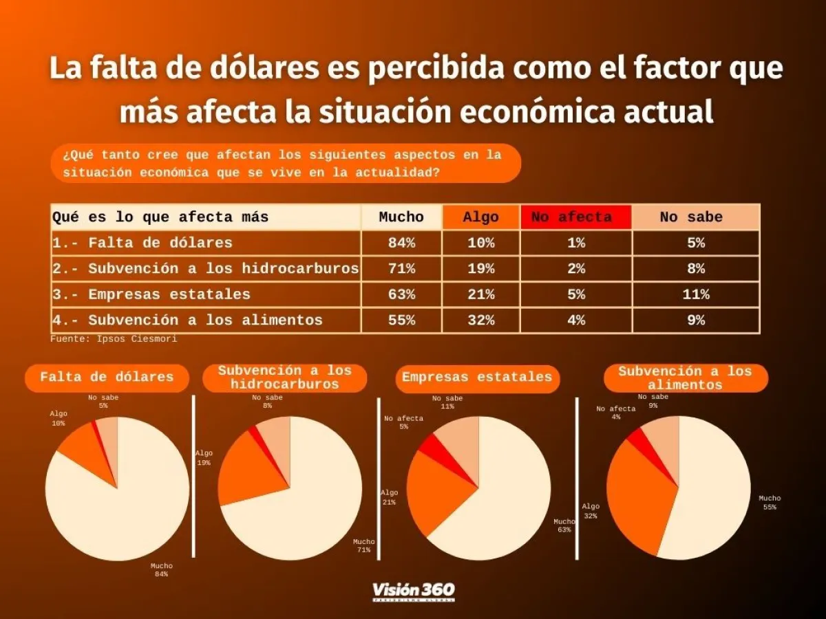 Un 84% respondió que la falta de dólares es percibido como el factor que más afecta la situación económica actual. Otro 71% piensa que el otro factor es la subvención a los carburantes, un 63%, lo que ocurre con las empresas estatales, y un 55%, la subvención a los alimentos.