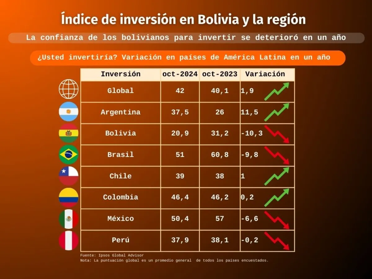El Índice de Inversión en Bolivia se ubica en 20,9 puntos, sugiriendo una tendencia conservadora de los consumidores hacia compras importantes o inversiones. Este comportamiento podría tener implicaciones para diversos sectores de la economía. Como referencia, países como Colombia y México muestran índices por encima de 45 puntos en este aspecto.