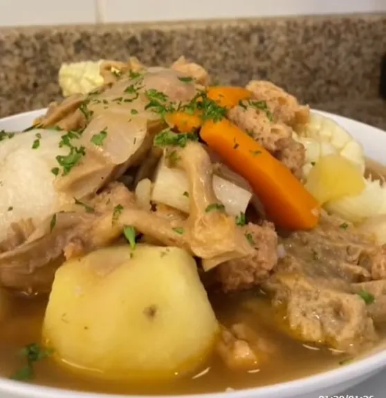 7 » Sirva en un plato hondo, con dos papas, unas rodajas de choclo, trozos de las tres carnes y tunta. Acabe con un poco de perejil.