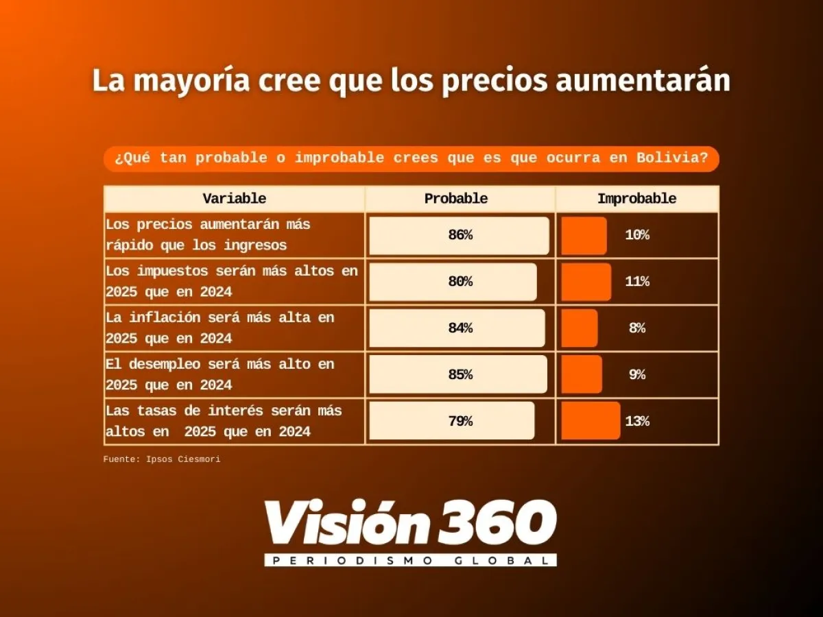 Most Bolivians believe that this year, price increases will outpace their incomes and unemployment will rise in the country, according to a recent survey by Ipsos CiesMori on the population’s perceptions for 2025.