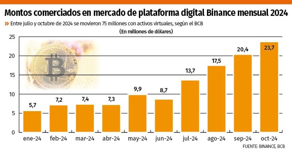 Los montos transados en la plataforma Binance a partir de la aprobación de la RD 082/2024, de 25 de junio de 2024, crecieron de 13,7 millones de dólares en julio, a 23,7 millones en octubre, acumulando en cuatro meses más de 75 millones de dólares.