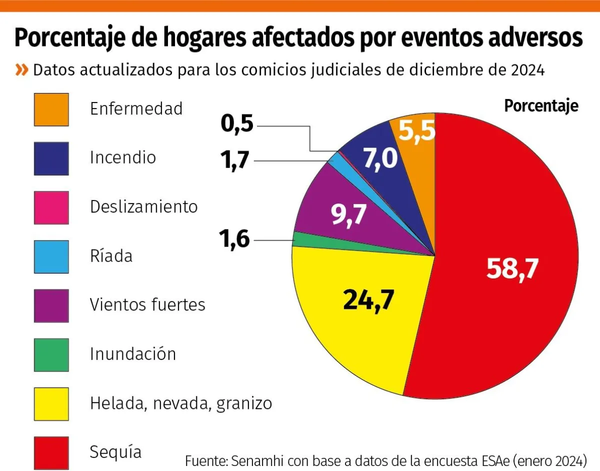 Los eventos adversos más frecuentes fueron: sequía reportada por el 58,7% de los hogares, las heladas nevadas y granizos (24%), vientos fuertes (9,7%), incendios (7%). La sequía y los incendios estuvieron mayormente presentes en los meses de agosto, septiembre y octubre; en cambio las enfermedades se presentaron en diciembre de 2023.