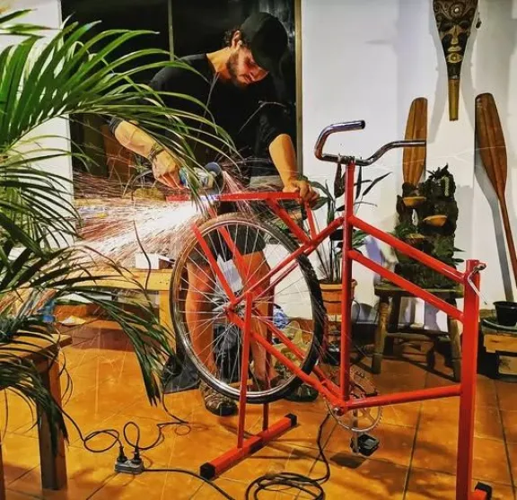 Para construirla, dice que tuvo que conseguir herramientas, el marco de una bici que estaba ya tirado y que prácticamente ya no servía para nada. También consiguió una licuadora quemada en la Cancha, el mercado popular de Cochabamba. “Empezamos con un amigo, con Jhonatan Cires, que es un amigo integrante de la Masa Crítica de Cochabamba, bien vinculado siempre a las bicicletas. Empezamos los dos a gestar esto así, a crearlo”, comentó.