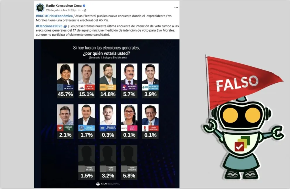Radio Kawsachun Coca (RKC) has repeatedly published images showing poll results from “Atlas Electoral,” where former president Evo Morales Ayma leads voting intention—even though he is not legally allowed to run. However, this company is neither accredited by the Supreme Electoral Tribunal (TSE) nor does it hold any commercial registration.