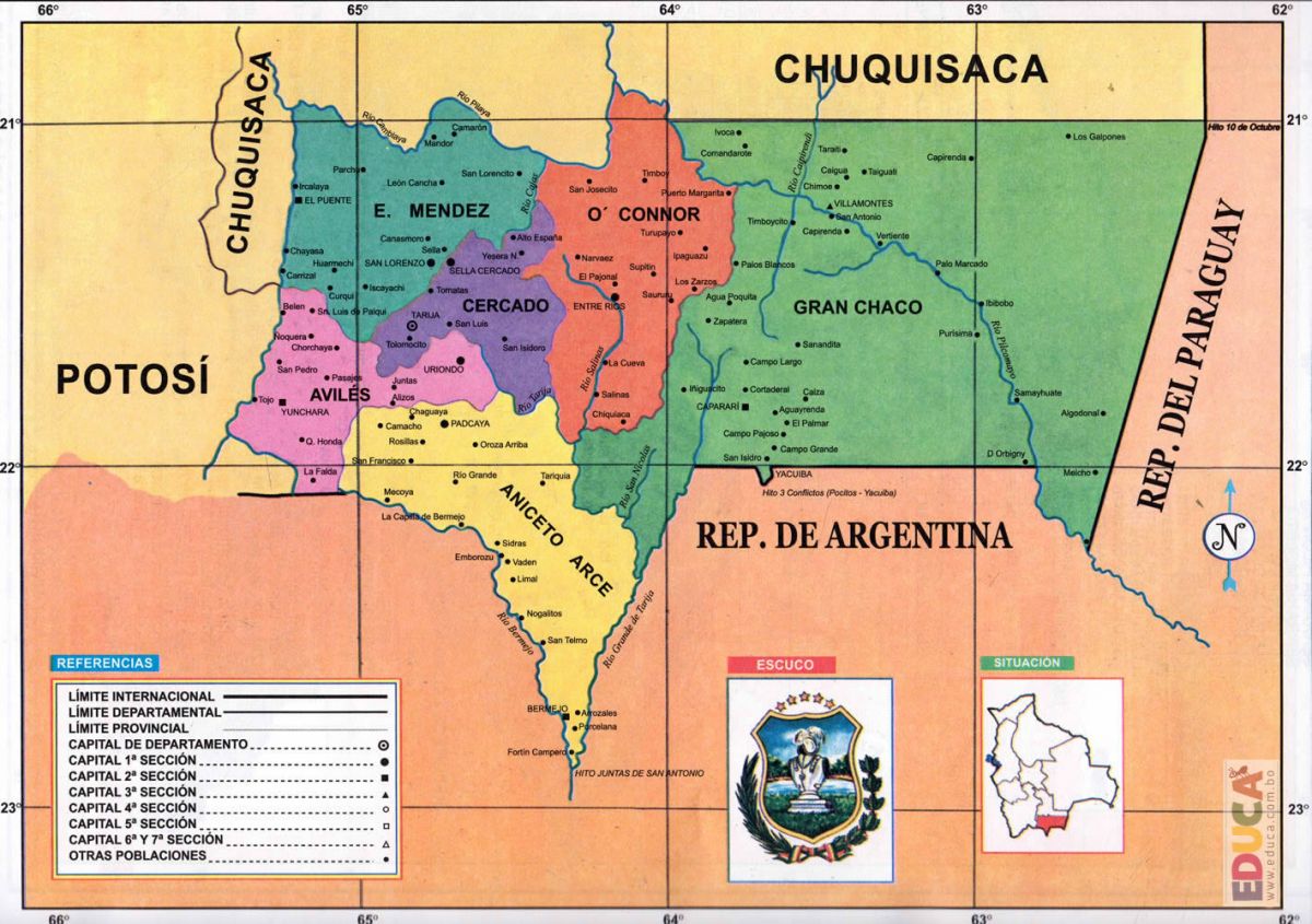 Today, the department of Tarija covers an area of approximately 37,623 km². It is divided into 6 provinces: Gran Chaco, Aniceto Arce, José María Avilés, Cercado, Eustaquio Méndez, and Burdet O’Connor.