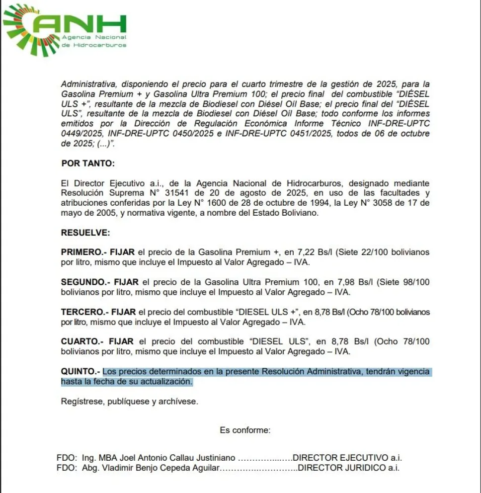 Mediante la Resolución Administrativa 0632/2025, que entró en vigencia este lunes 6 de octubre, la Agencia Nacional de Hidrocarburos (ANH) fijó nuevos precios para tres tipos de combustibles: la gasolina Premium +, la gasolina Ultra Premium 100 y el diésel ULS +.