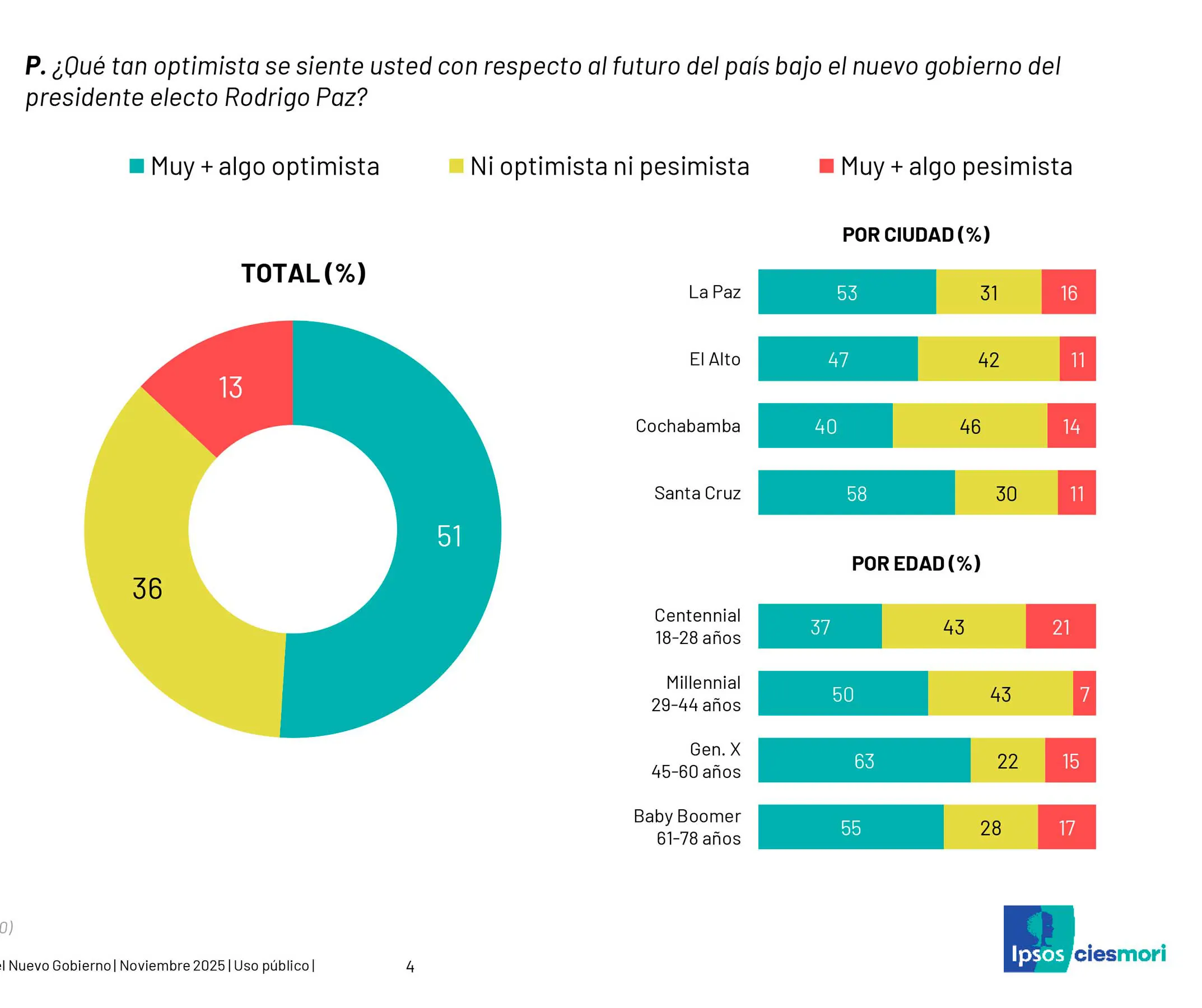The beginning of President Rodrigo Paz Pereira’s administration is marked by notable—though not yet consolidated—optimism. According to Ipsos Ciesmori’s special report Expectations for the New Government, 51% of respondents described themselves as “very optimistic” about the country’s future under the new administration, compared to only 13% who feel pessimistic. However, a significant portion of citizens—36%—remains neutral (“neither optimistic nor pessimistic”), reflecting a cautious wait-and-see attitude toward the government’s early actions.