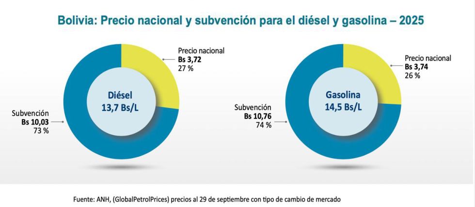 La dimensión económica del subsidio se explica mejor al revisar la enorme diferencia entre el precio real de importación y el precio de venta al público. Utilizando precios de referencia internacional y el tipo de cambio de mercado a finales de septiembre de 2025, el informe detalla que el precio real de un litro de gasolina debería rondar los Bs 14,5 bolivianos, y el del diésel los Bs 13,7.