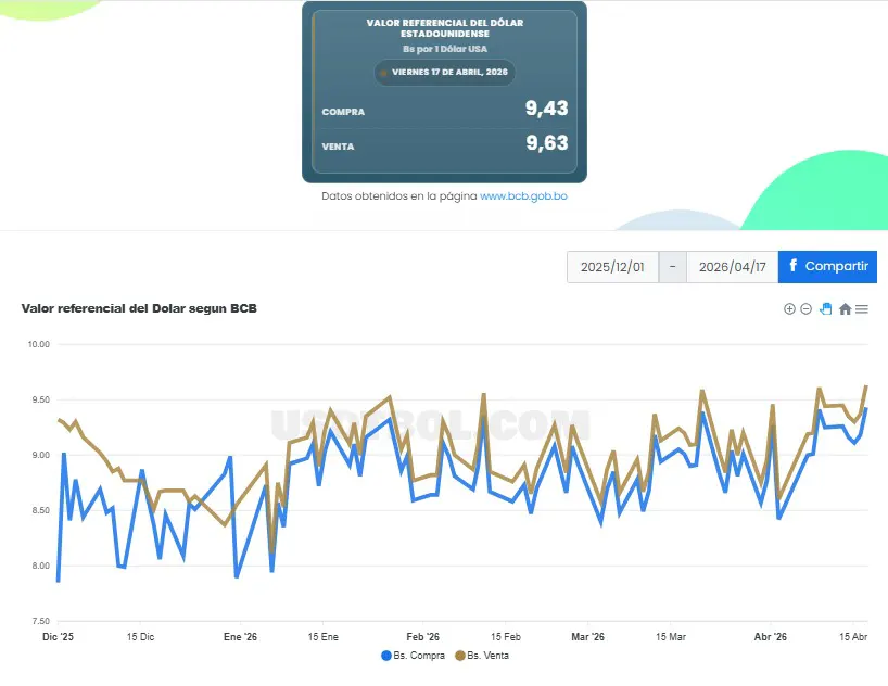 Over the weekend, the Central Bank of Bolivia’s reference exchange rate reached its highest level since its creation on December 1, 2025, hitting a selling price of 9.63 bolivianos per dollar.
